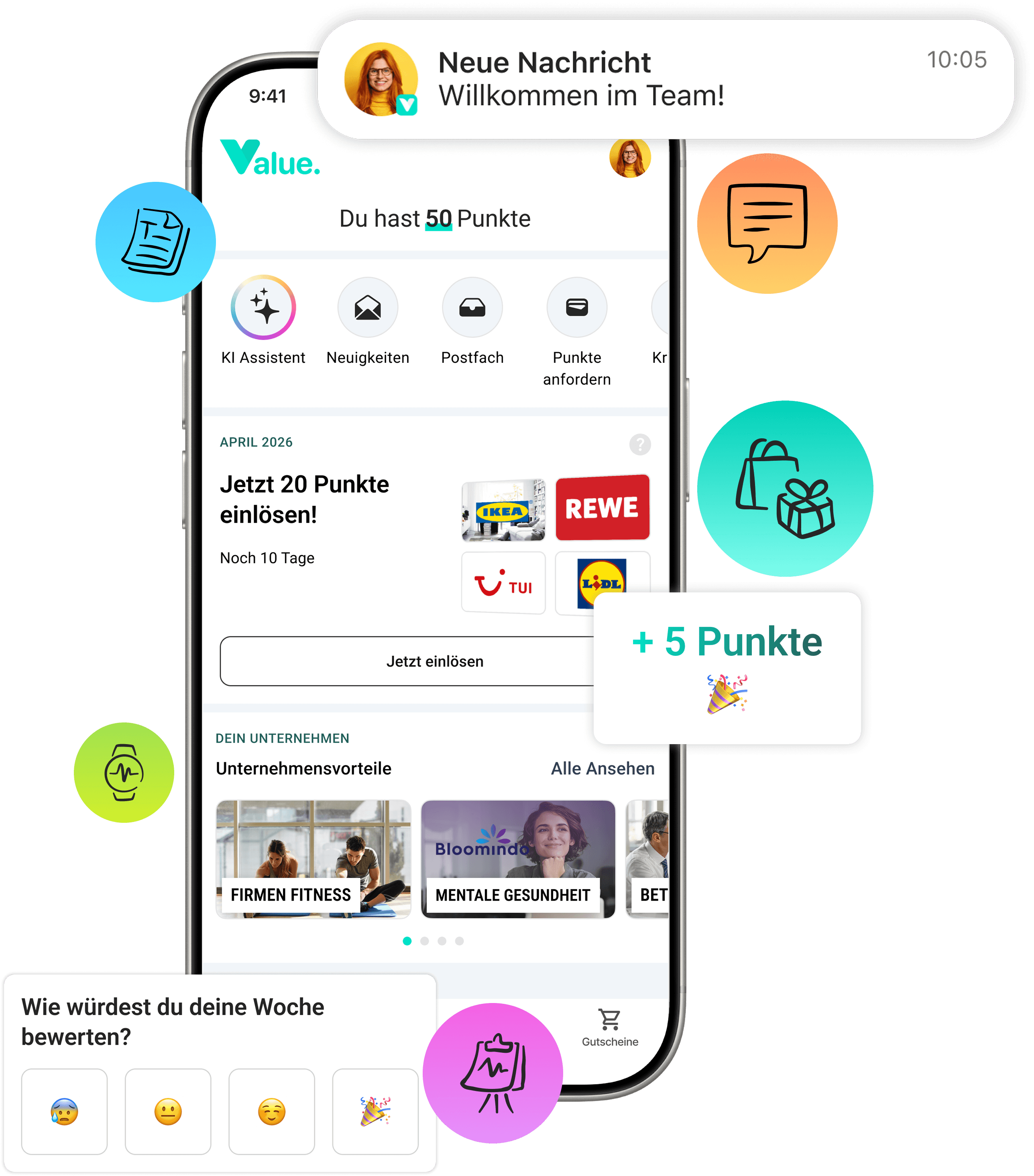 Die Value EX Plattform verbindet Bonussystem, Kommunikation, Befragungen und Gesundheit in einer App – erreichbar für jeden Mitarbeitenden, entlastend für jede Führungskraft.